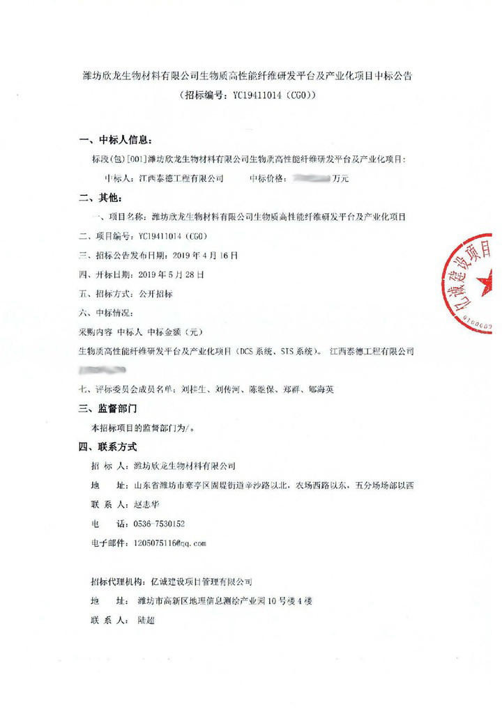 2019年5月28日,濰坊欣龍生物材料有限公司生物質(zhì)高性能纖維研發(fā)平臺及產(chǎn)業(yè)化項(xiàng)目(DCS系統(tǒng)、SIS系統(tǒng))公開開標(biāo),江西泰德工程有限公司中標(biāo)。