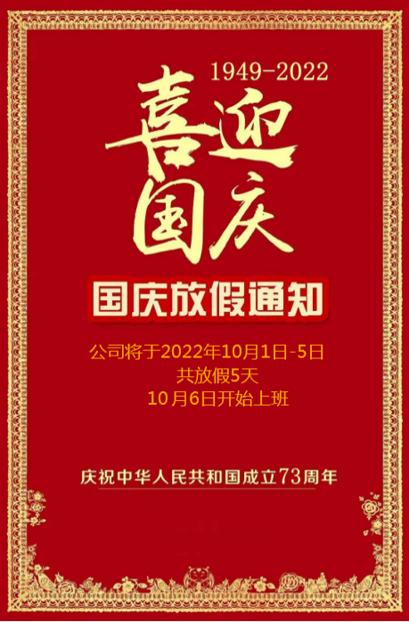 尊敬的廣大客戶: 您們好!2022國慶將至,我司國慶節(jié)放假安排如下:2022年10月1日—5日放假,共計5天!10月6日(星期四)開始上班,不便之處敬請諒解!? 大家節(jié)日快樂,生意興?。?2022-09-28查看詳情 -