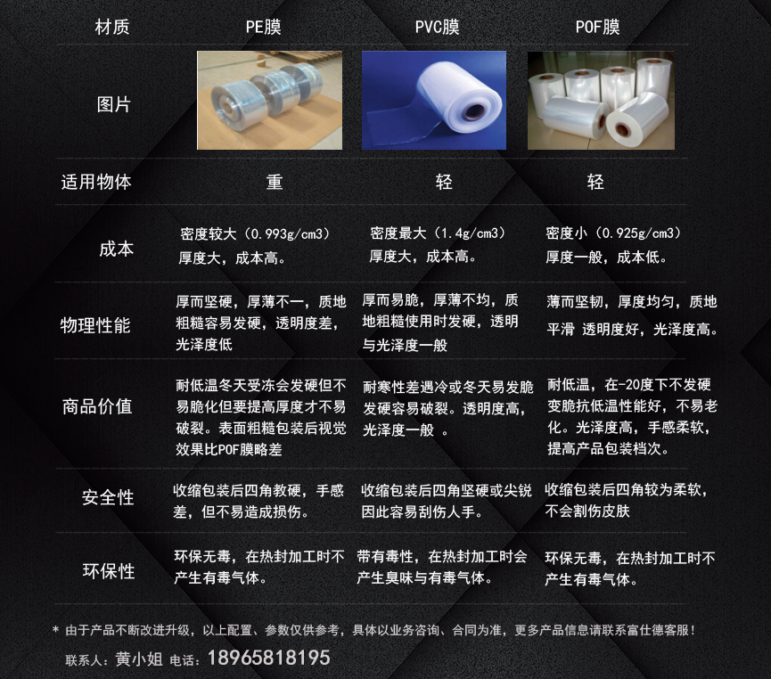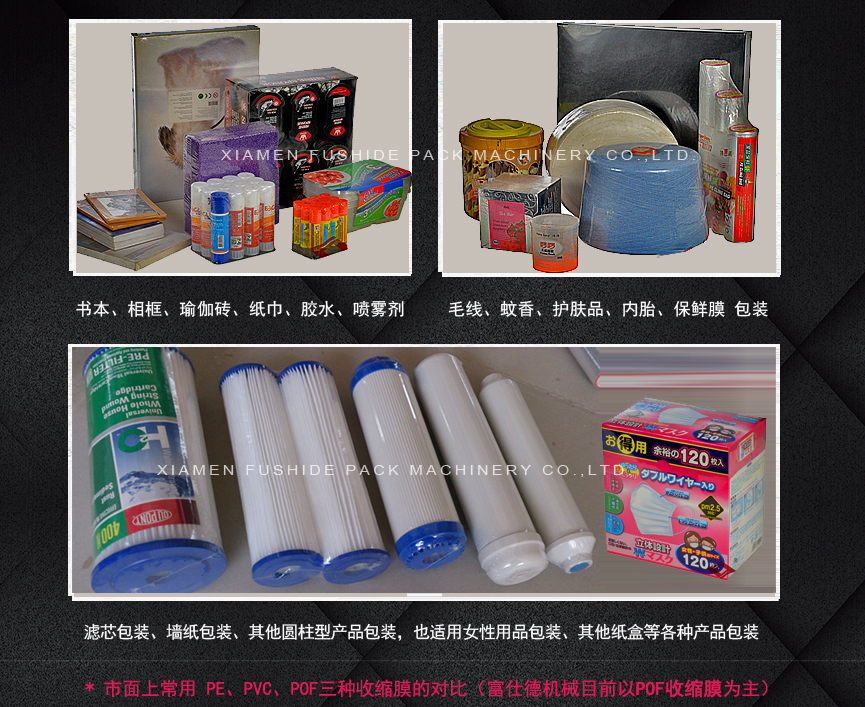 產(chǎn)品特點(diǎn):收縮過程中,不影響包裝物的品質(zhì),而能收縮快速完美,包裝后的產(chǎn)品能密封、防潮、防撞擊、適用于多件物品緊包裝和托盤包裝。