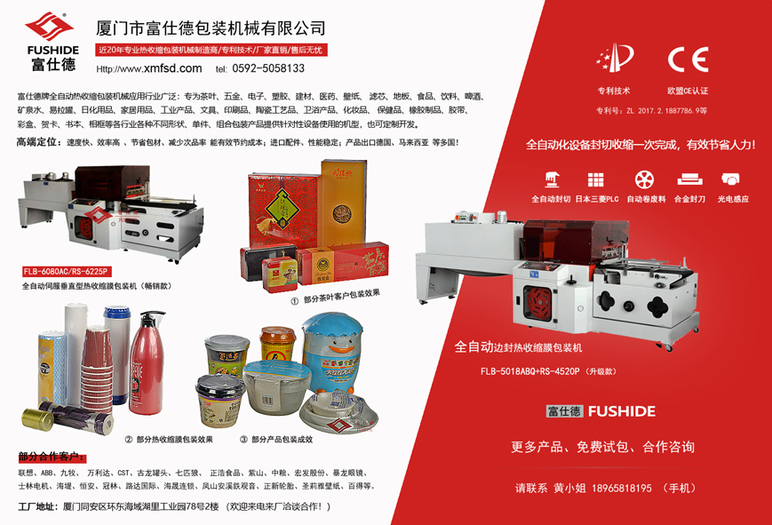 富仕德包裝機械公司坐落于廈門市,創(chuàng)建于一九九八年,是一家專業(yè)從事科研、設(shè)計、制造和銷售熱收縮機,熱收縮包裝機,熱收縮膜包裝機,全自動熱收縮包裝機,全自動熱收縮膜包裝機為一體的實業(yè)公司,生產(chǎn)多個系列的包裝機械產(chǎn)品:包括熱收縮機,全自動熱收縮包裝機,熱收縮包裝機,全自動熱收縮膜包裝機,熱收縮膜機,熱收縮膜,收縮膜包裝機,熱收縮膜機,食品包裝機,茶葉包裝機,多功能包裝機,全自動包裝機,開箱機,封箱機,包裝材料,POF熱收縮膜等,客戶遍布全國各地和海外地區(qū),其中福建本地客戶主要集中在廈門、泉州、漳州、福州、莆田等,公司定位于設(shè)計制造中高端的全自動熱收縮膜包裝機械:包括食品包裝機、陶瓷包裝機、茶葉包裝機、壁紙包裝機、濾芯包裝機、飲料包裝機、衛(wèi)浴包裝機、日化產(chǎn)品包裝機、電子包裝機、五金包裝機、橡膠制品包裝機、墻紙包裝機、膠帶包裝機、化妝品包裝機、保健品包裝機、印刷品包裝機、彩盒包裝機、圓柱體包裝機、餐具包裝機、家居用品包裝機、瑜伽墊包裝機等適應(yīng)各行業(yè)不同形狀、單件、組合包裝產(chǎn)品;用于各行業(yè)產(chǎn)品的批量化包裝生產(chǎn);技術(shù)領(lǐng)先、制造精良,結(jié)實耐用; 我們具備廠家:從研發(fā)、生產(chǎn)、銷售、售后,以及穩(wěn)定的質(zhì)量和可控合理的價格等優(yōu)勢;公司擁有多項國家專利技術(shù)并通過歐盟CE認證,產(chǎn)品采用進口知名品牌核心部件等,經(jīng)過近20年專業(yè)研發(fā)、設(shè)計經(jīng)驗使得富仕德包裝機械產(chǎn)品更加卓越、穩(wěn)定、效率更高,更節(jié)約包材成本。
