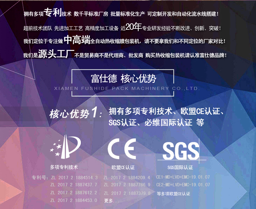 富仕德包裝機械公司坐落于廈門市,創(chuàng)建于一九九八年,是一家專業(yè)從事科研、設(shè)計、制造和銷售熱收縮機,熱收縮包裝機,熱收縮膜包裝機,全自動熱收縮包裝機,全自動熱收縮膜包裝機為一體的實業(yè)公司,生產(chǎn)多個系列的包裝機械產(chǎn)品:包括熱收縮機,全自動熱收縮包裝機,熱收縮包裝機,全自動熱收縮膜包裝機,熱收縮膜機,熱收縮膜,收縮膜包裝機,熱收縮膜機,食品包裝機,茶葉包裝機,多功能包裝機,全自動包裝機,開箱機,封箱機,包裝材料,POF熱收縮膜等,客戶遍布全國各地和海外地區(qū),其中福建本地客戶主要集中在廈門、泉州、漳州、福州、莆田等,公司定位于設(shè)計制造中高端的全自動熱收縮膜包裝機械:包括食品包裝機、陶瓷包裝機、茶葉包裝機、壁紙包裝機、濾芯包裝機、飲料包裝機、衛(wèi)浴包裝機、日化產(chǎn)品包裝機、電子包裝機、五金包裝機、橡膠制品包裝機、墻紙包裝機、膠帶包裝機、化妝品包裝機、保健品包裝機、印刷品包裝機、彩盒包裝機、圓柱體包裝機、餐具包裝機、家居用品包裝機、瑜伽墊包裝機等適應(yīng)各行業(yè)不同形狀、單件、組合包裝產(chǎn)品;用于各行業(yè)產(chǎn)品的批量化包裝生產(chǎn);技術(shù)領(lǐng)先、制造精良,結(jié)實耐用; 我們具備廠家:從研發(fā)、生產(chǎn)、銷售、售后,以及穩(wěn)定的質(zhì)量和可控合理的價格等優(yōu)勢;公司擁有多項國家專利技術(shù)并通過歐盟CE認(rèn)證,產(chǎn)品采用進(jìn)口知名品牌核心部件等,經(jīng)過近20年專業(yè)研發(fā)、設(shè)計經(jīng)驗使得富仕德包裝機械產(chǎn)品更加卓越、穩(wěn)定、效率更高,更節(jié)約包材成本。
