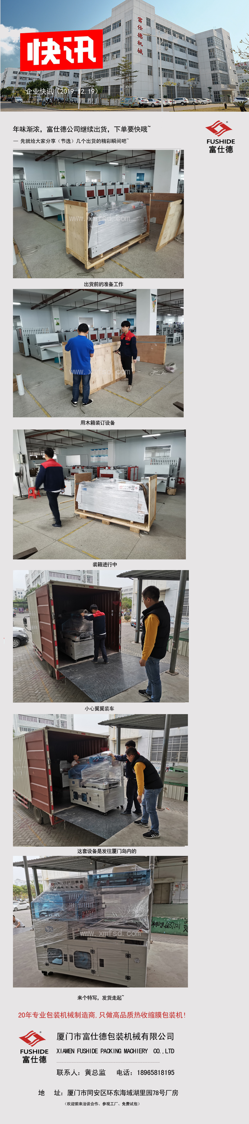 富仕德公司本周出貨快訊: - 又到一年熱收縮膜包裝機、熱收縮機、POF熱收縮膜銷售旺季,富仕德車間一片繁忙景象,客戶訂單陸續(xù)出貨中!